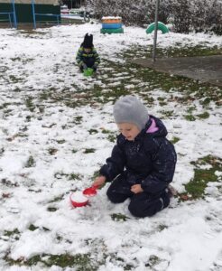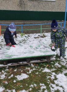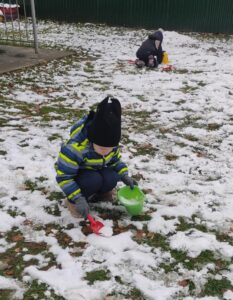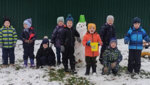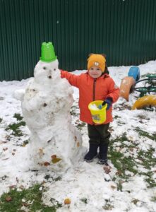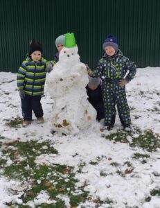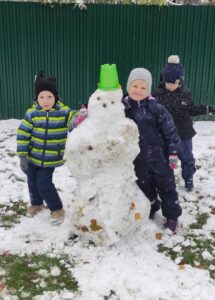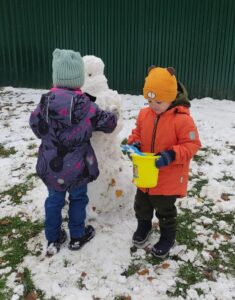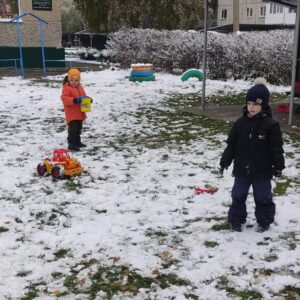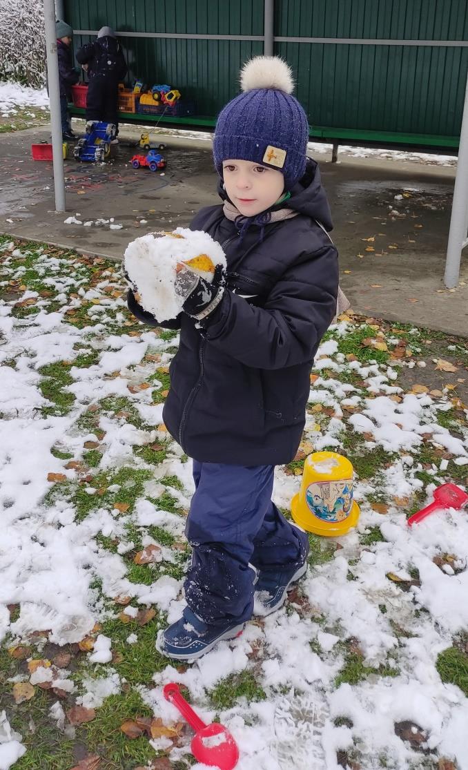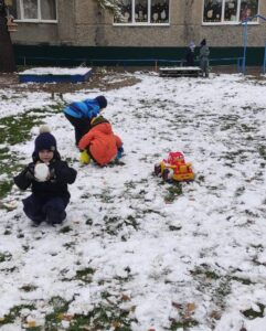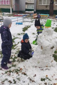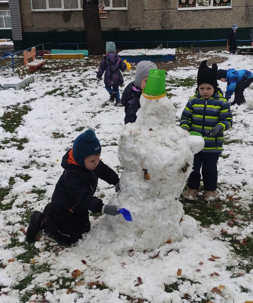 Сегодня прогулки в детском саду особенные, детей порадовал первый снег. Кругом слышен весёлый и звонкий смех. Ребята с большим удовольствием поиграли со снегом и даже слепили  снеговика.