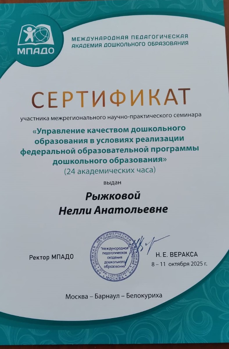 Межрегиональный научно- практический семинар ” Управление качеством дошкольного образования в условиях реализации федеральной образовательной программы дошкольного образования”.