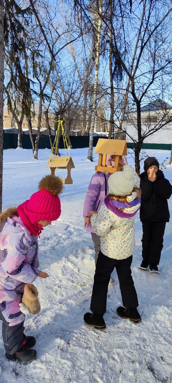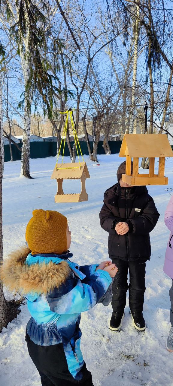 А итогом нашего мероприятия стало развешивание кормушек в птичьей столовой и любимые вкусности для синичек от наших ребят.