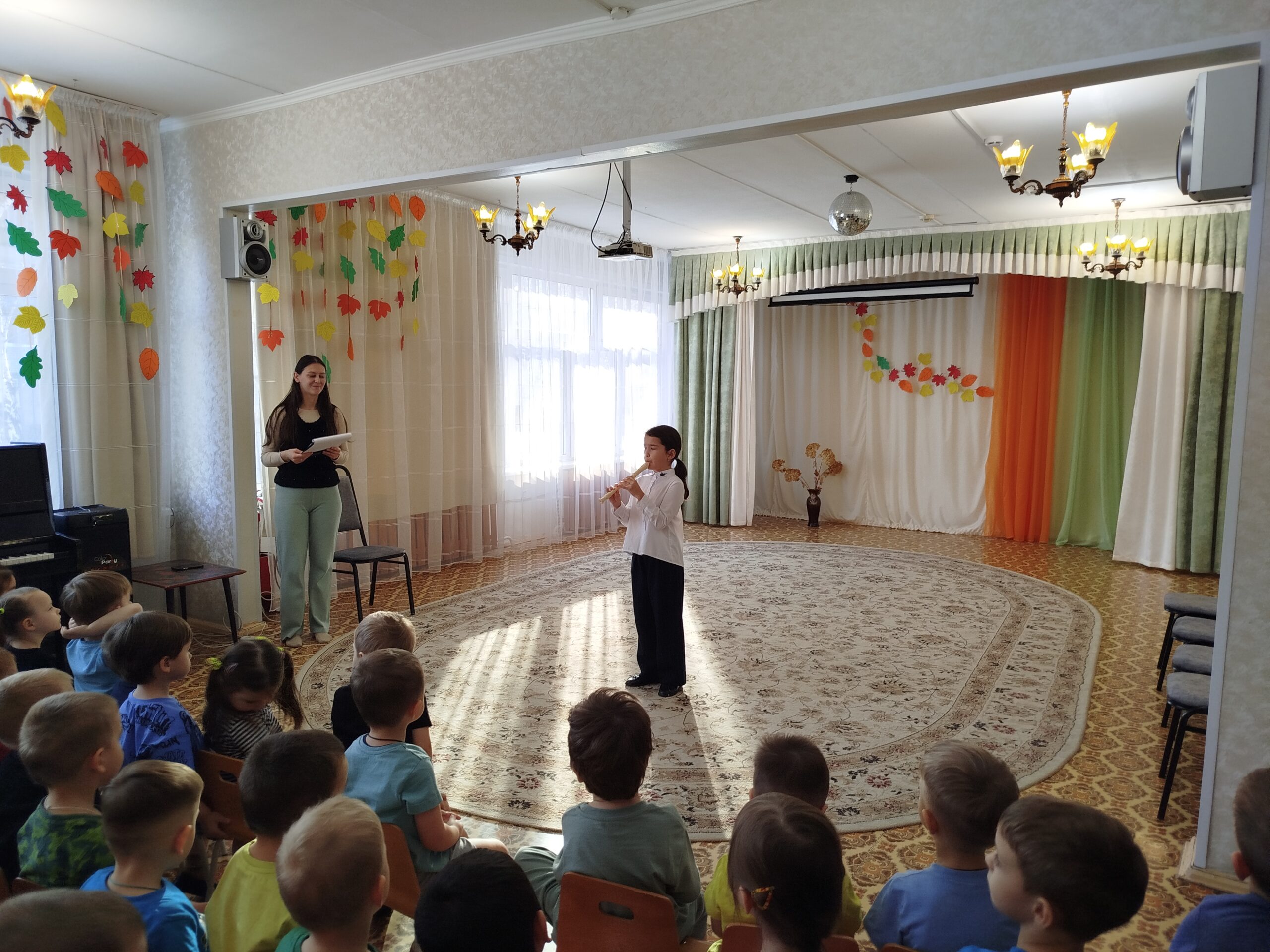 В саду с концертом выступили обучающиеся музыкальной школы и их педагоги. Воспитанники проявляли любознательность и активно приняли участие в познавательной беседе. С большим интересом слушали выступления юных музыкантов, расширили знания о музыкальных инструментах: фортепиано, домре, гитаре, барабане, блок-флейте, скрипке. Маленькие слушатели с удовольствием погрузились в мир музыки, стихов, музыкальных загадок и игр.