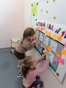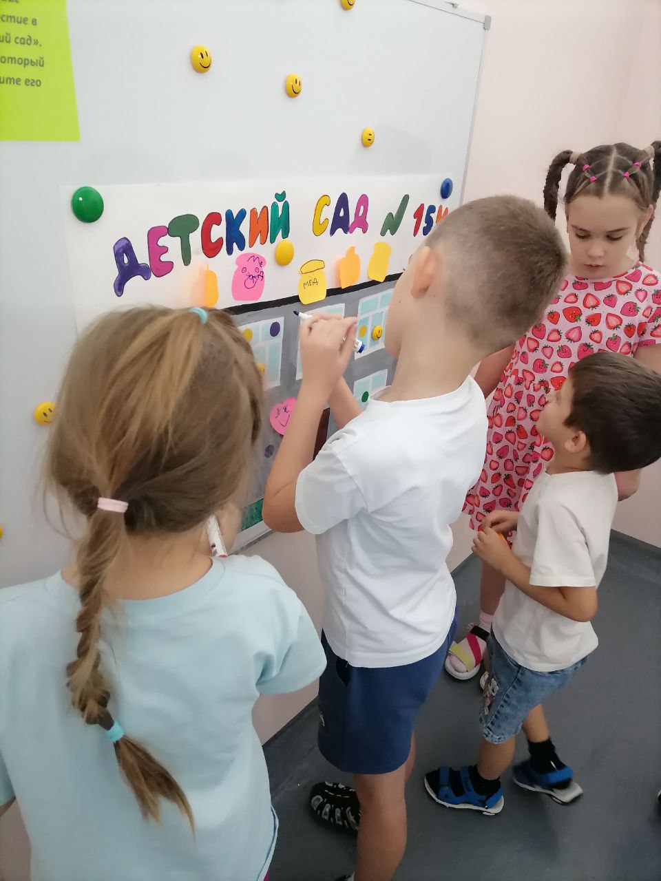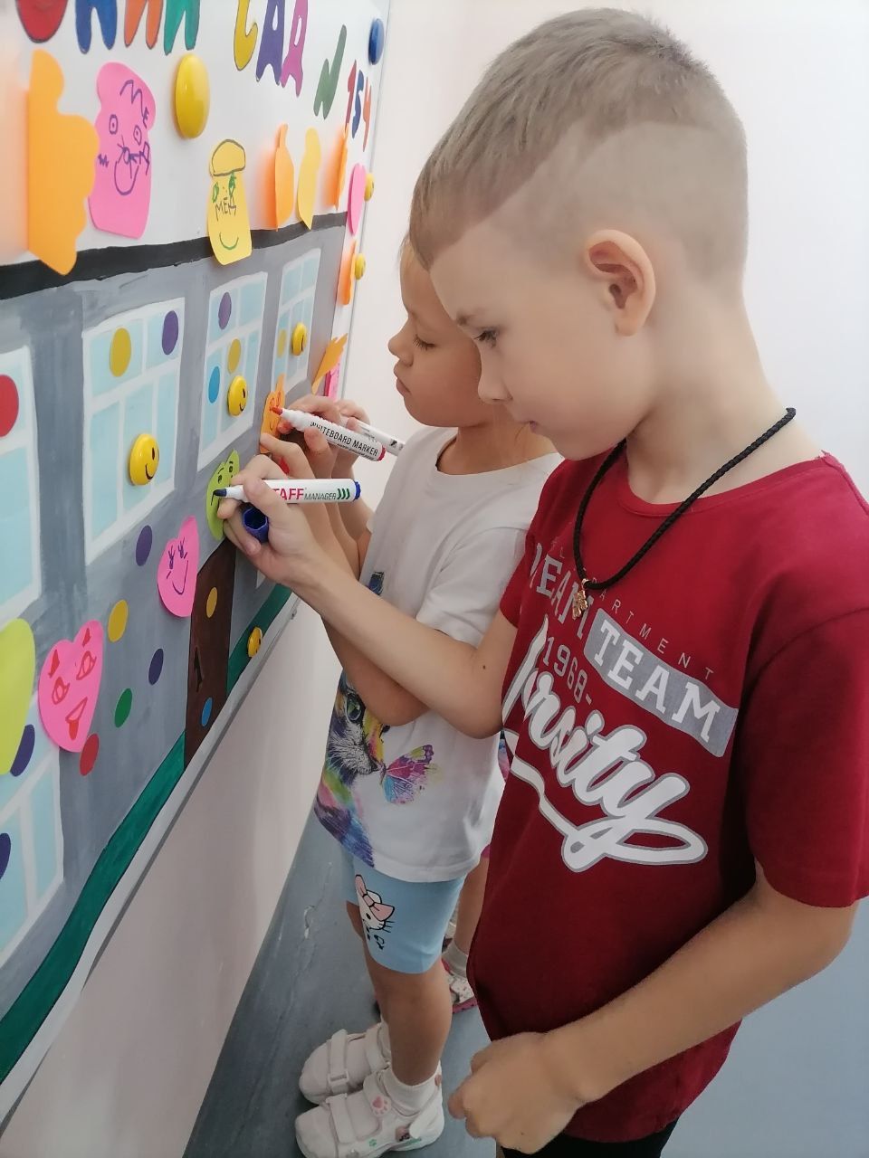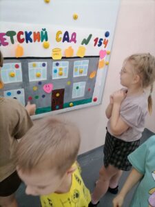 Основой арт-объекта стало большое полотно с изображением нашего садика. Педагог-психолог Татьяна Валентиновна Шуменко представила проект и объяснила простое правило: «Настроение – это как цвет! Выберите с детьми тот  цвет, который подходит Вам сейчас, и прикрепи его к нашей основе». Мы специально подчеркнули, что нет «плохих» или «хороших» чувств — все эмоции важны и имеют право на существование.