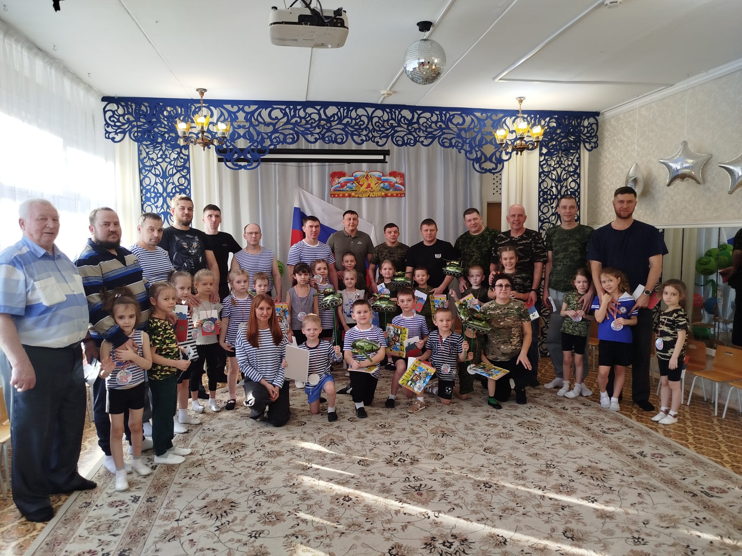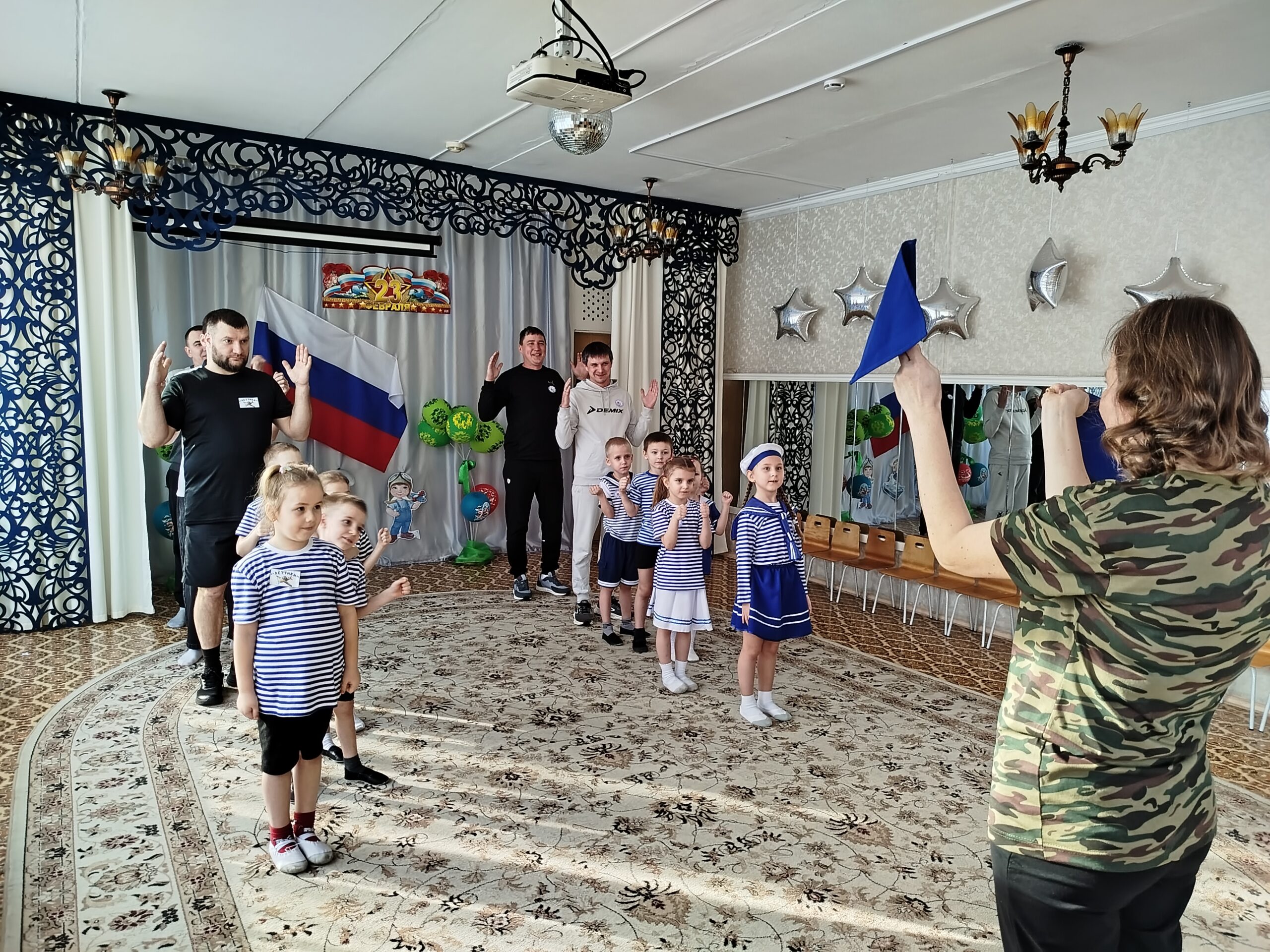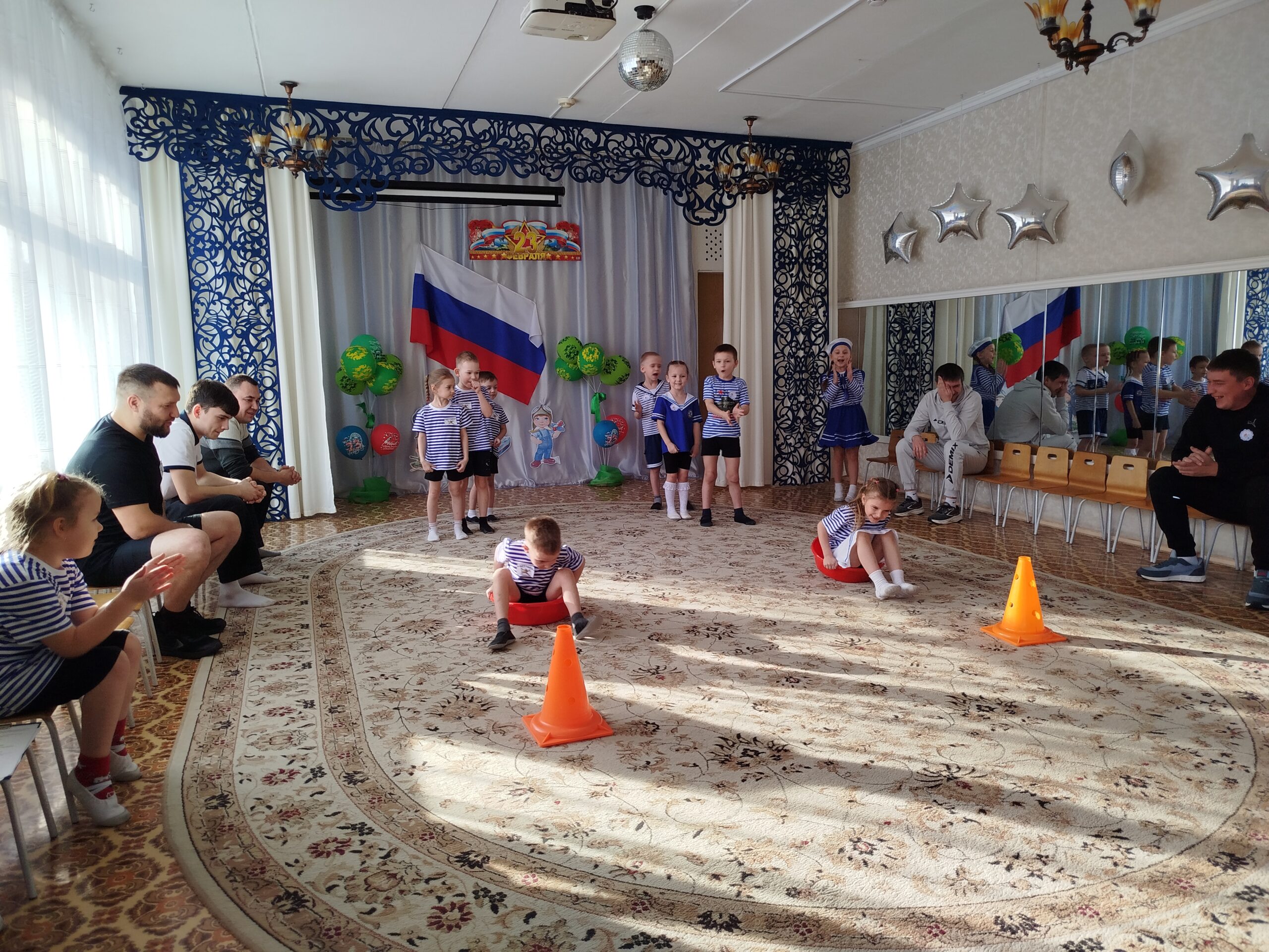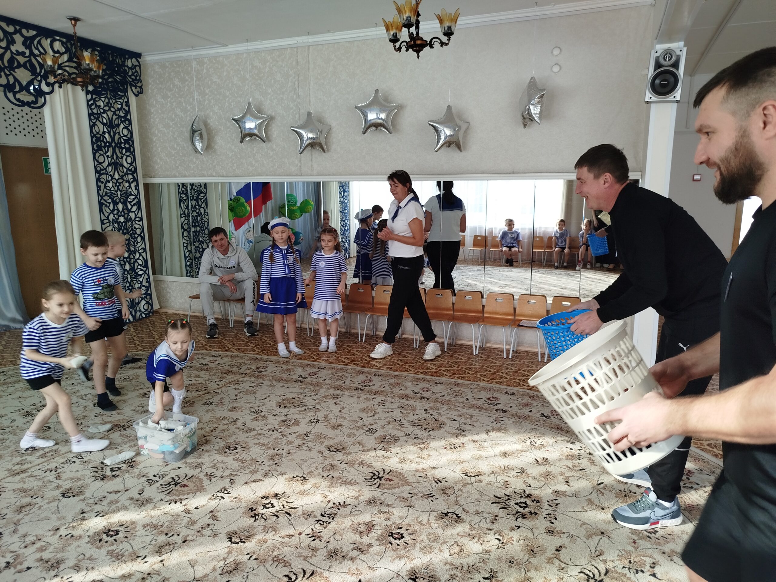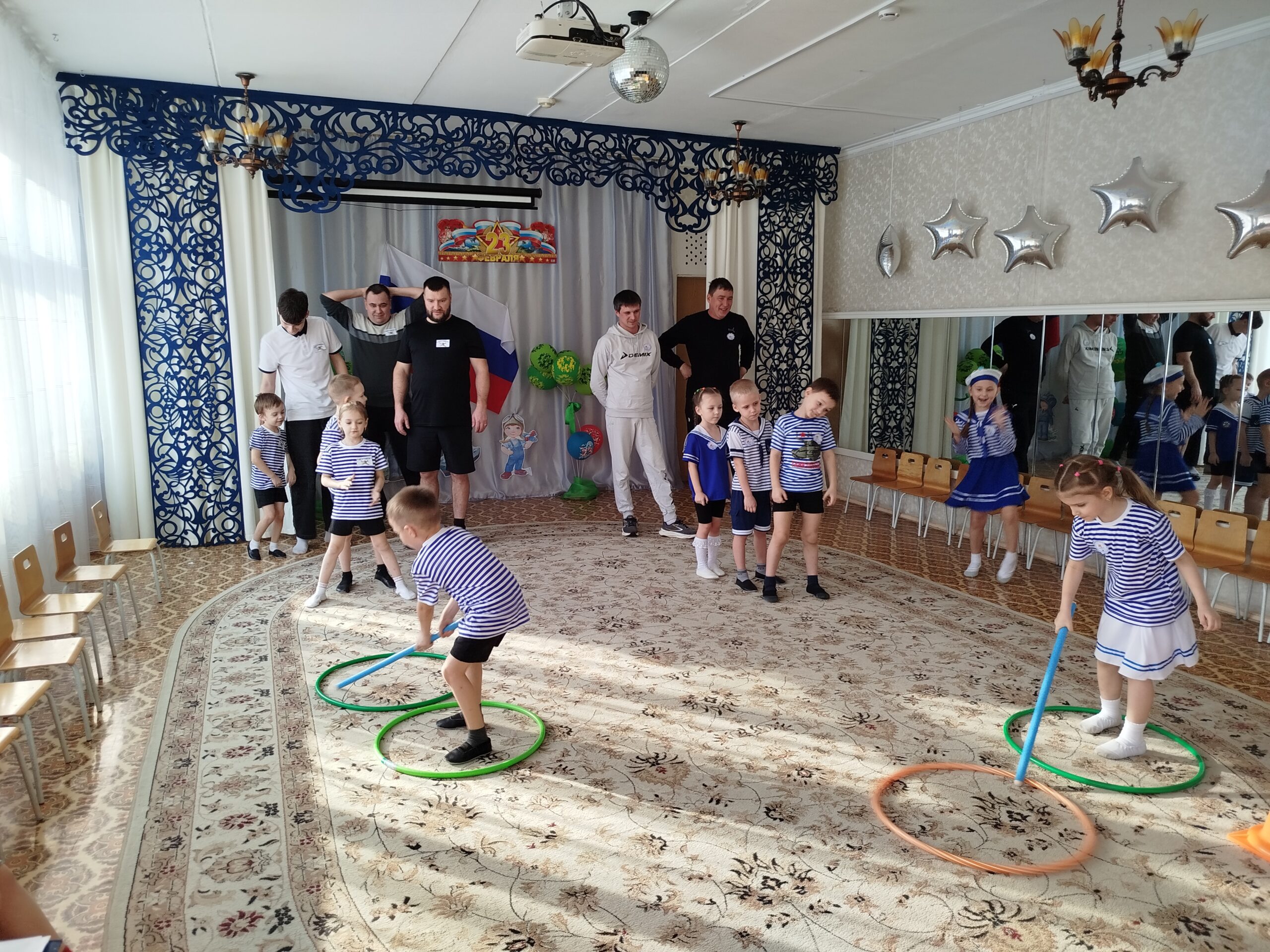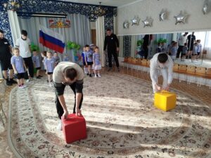 По традиции, музыкальный руководитель совместно с педагогами старшей и подготовительной групп подготовили музыкально – спортивный праздник, на который были приглашены папы. Маленьким спортсменам предстояло пройти эстафеты и соревноваться в ловкости, силе, смелости и находчивости вместе со своими папами. Поздравлять пап стихами, задорной песней, подарками, сделанными своими руками.