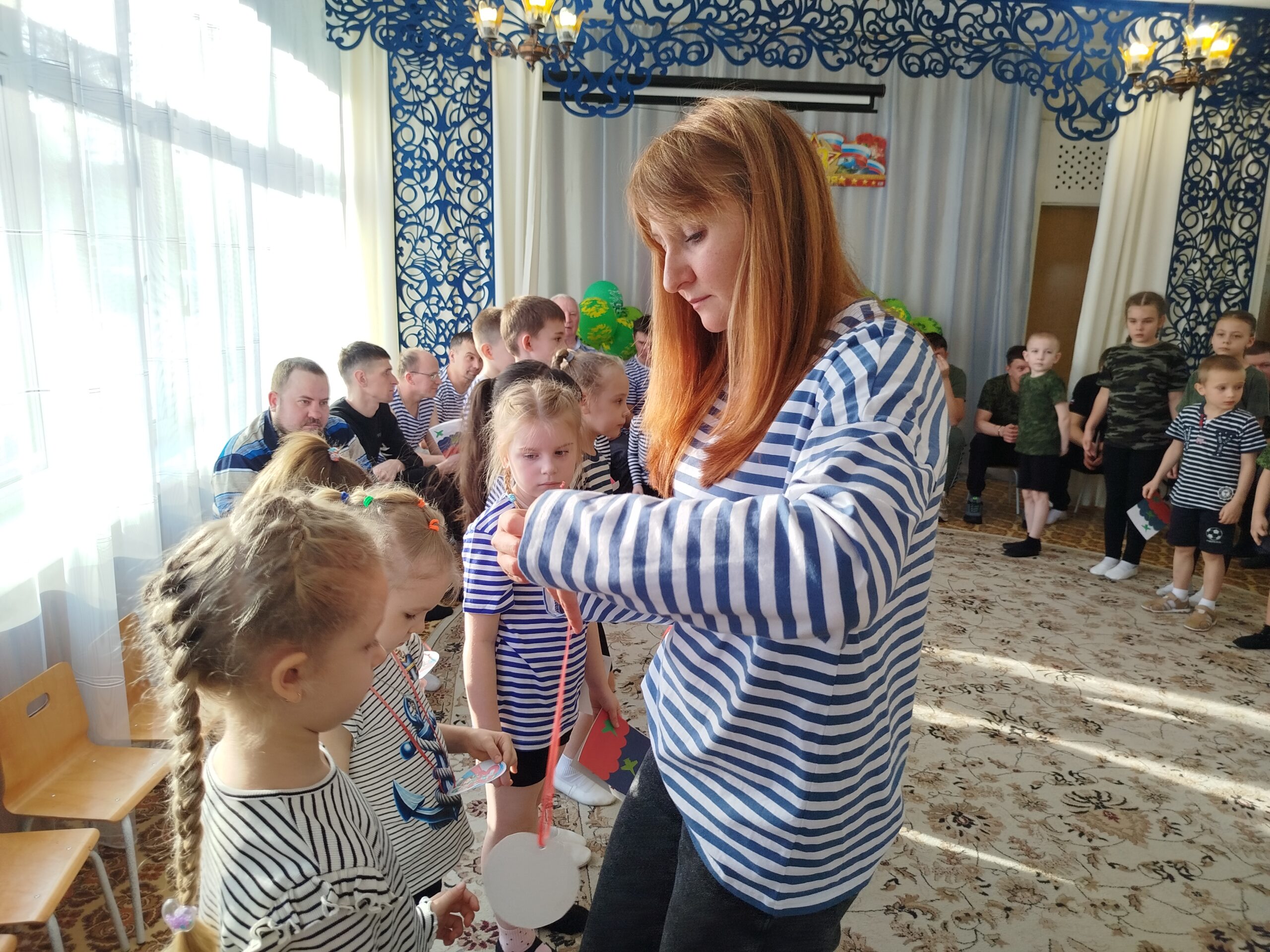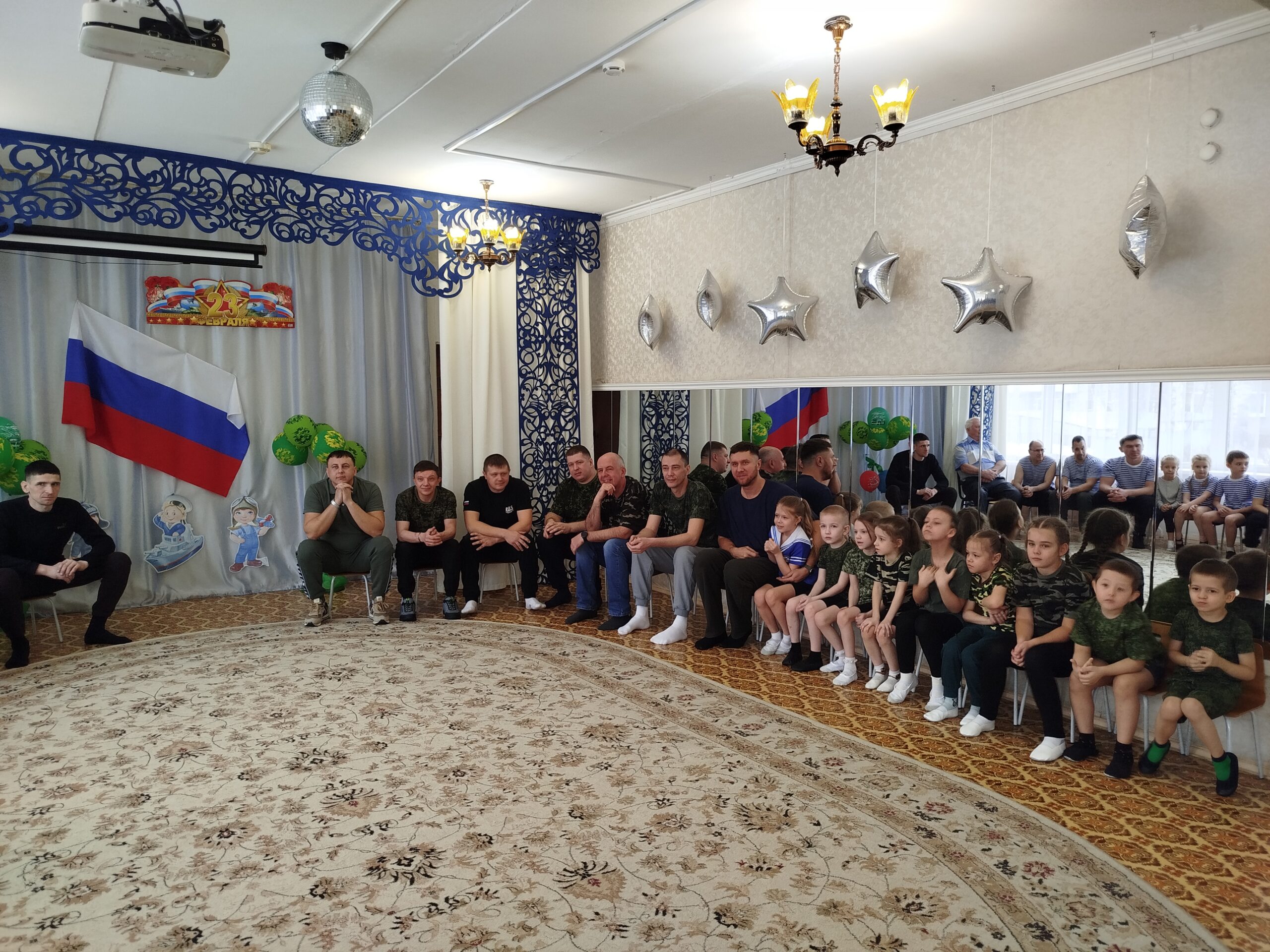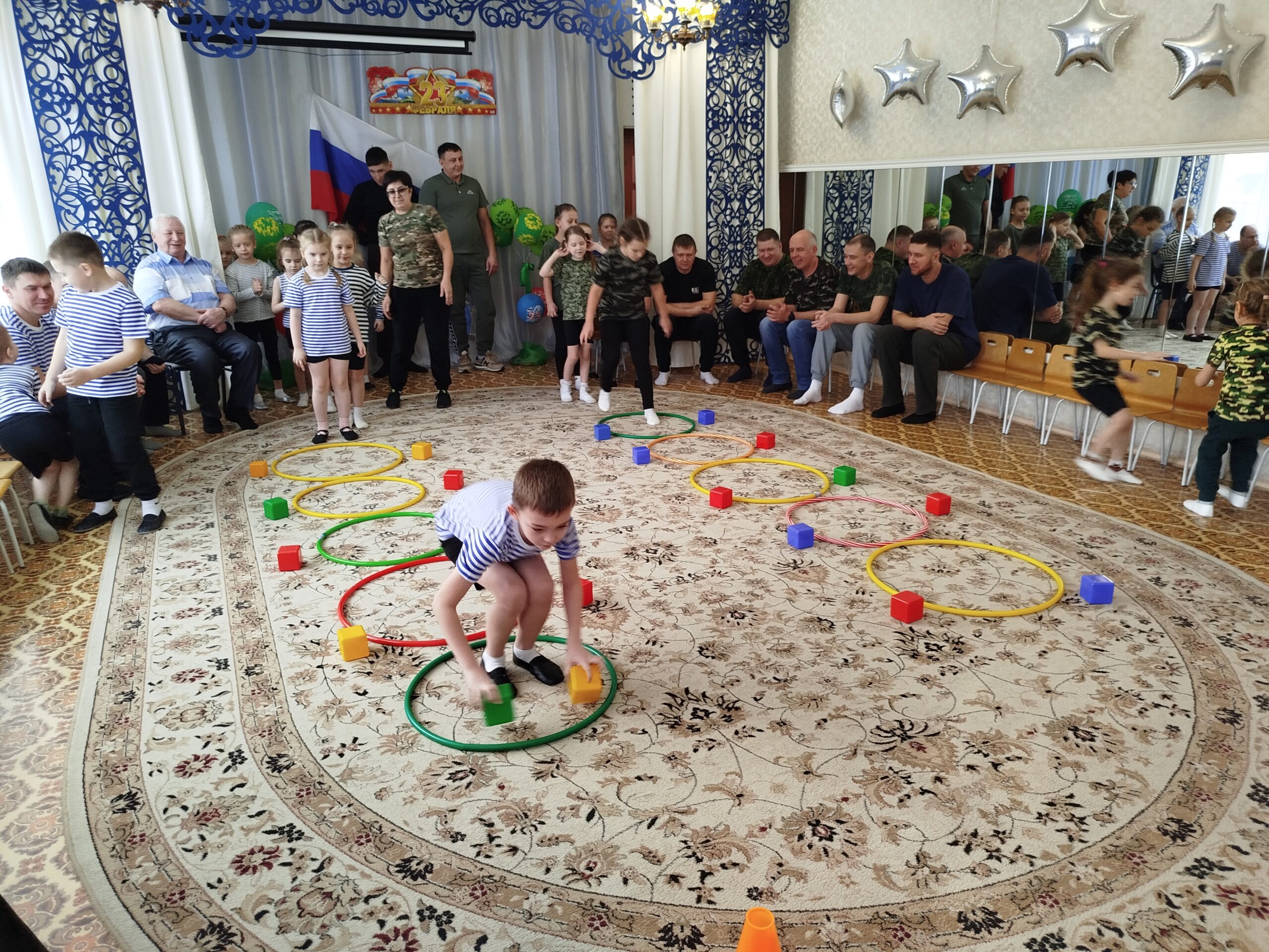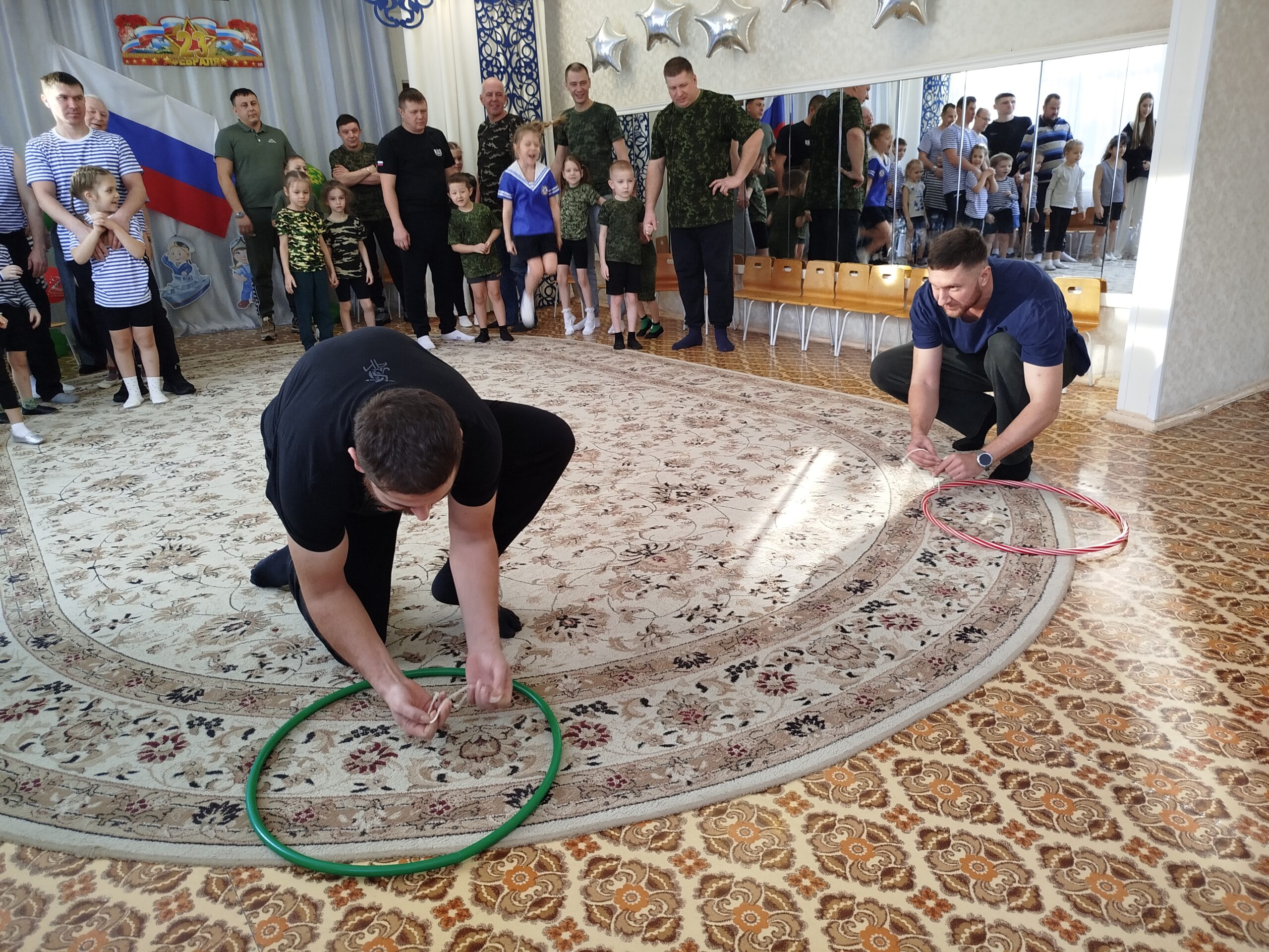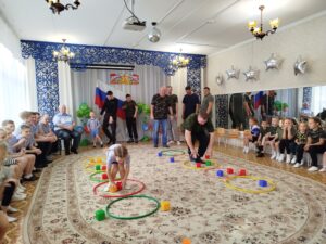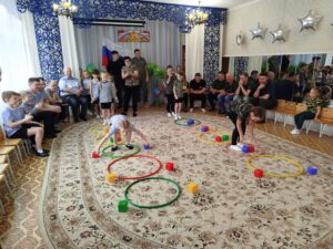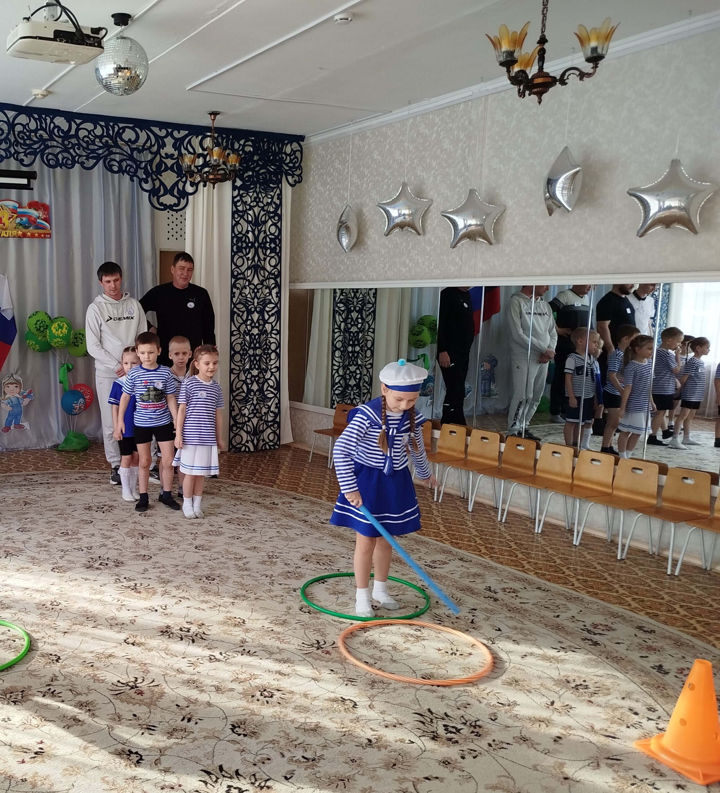 По традиции, музыкальный руководитель совместно с педагогами старшей и подготовительной групп подготовили музыкально – спортивный праздник, на который были приглашены папы. Маленьким спортсменам предстояло пройти эстафеты и соревноваться в ловкости, силе, смелости и находчивости вместе со своими папами. Поздравлять пап стихами, задорной песней, подарками, сделанными своими руками.